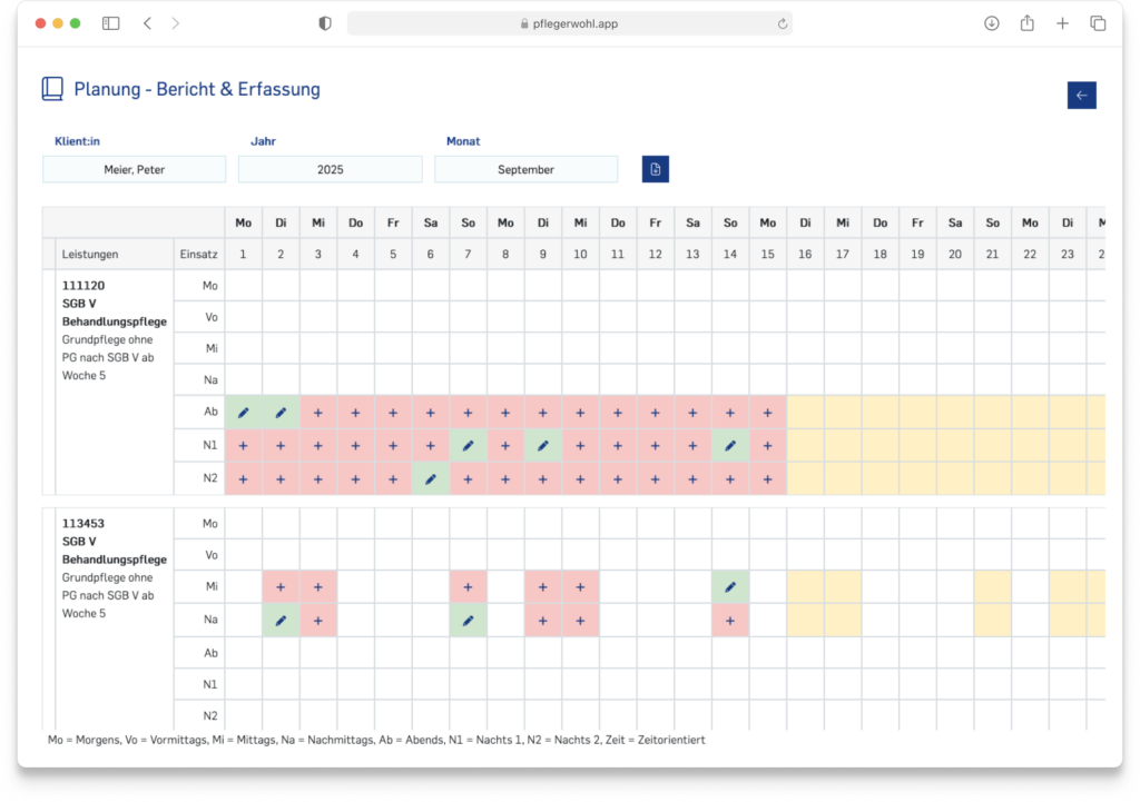 Wochen- und Monatspläne, automatisierte Verteilung und Abgleich von geplanten und erbrachten Leistungen.